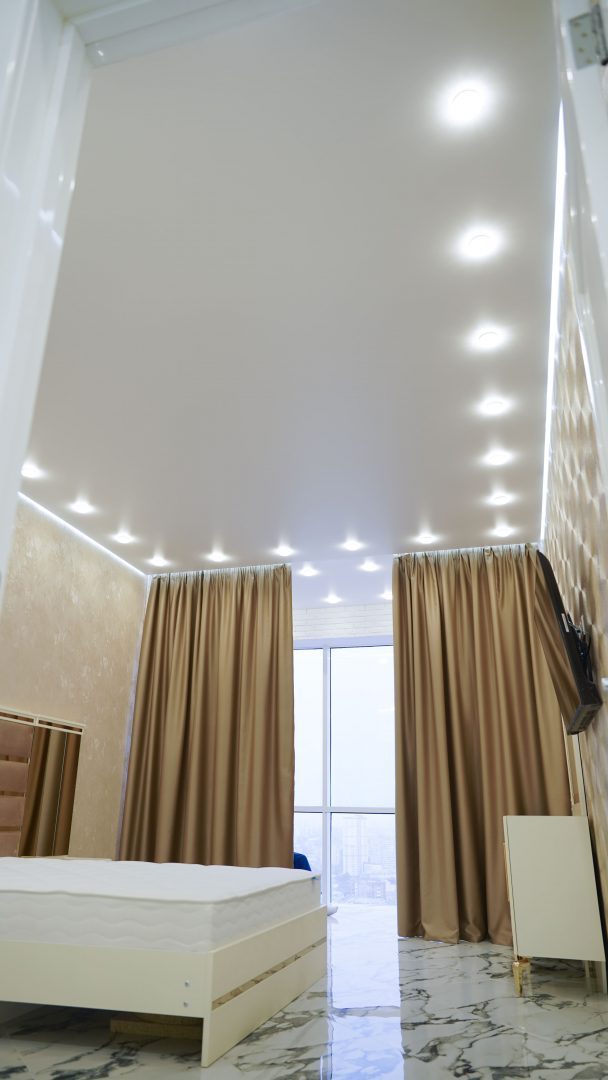 Помимо того, что лучшие сатиновые натяжные потолки абсолютно не бликуют, а мягко рассеивают свет, они также способны менять оттенок в зависимости от типа и интенсивности освещения. Их натуральный цвет можно увидеть только днем. Вечером же, при свете ламп, сатиновые натяжные потолки кажутся светлее. Тем самым создается дополнительный визуальный простор и уют. И это еще один плюс сатиновых натяжных потолков.